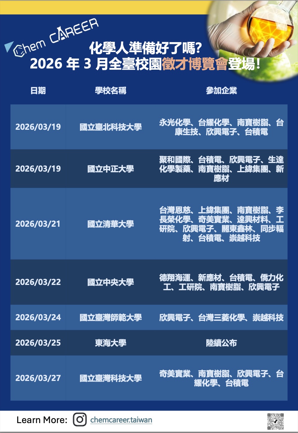 化學產業徵才博覽會整理全台校園徵才活動內容(化學相關企業)如附件: 鼓勵畢業班學生,多到各校的徵才活動走走看看、多聽聽企業的介紹,了解產業需求,也為自己的職涯發展做更好的規劃。詳如附件,活動資訊將持續更新。